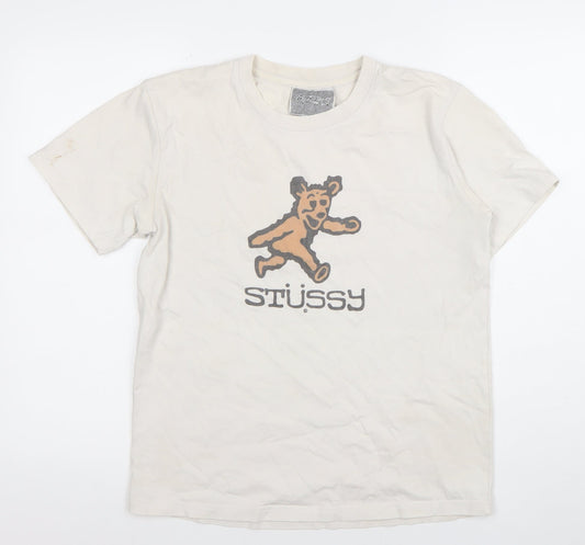 Stussy Women Beige Graphic Bear T-Shirt M Vintage Casual Top