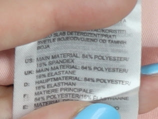 - Material Breakdown: 84% Polyester 16% Elastane