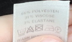 - Material Breakdown: 66% Polyester 31% Viscose 3% Elastane