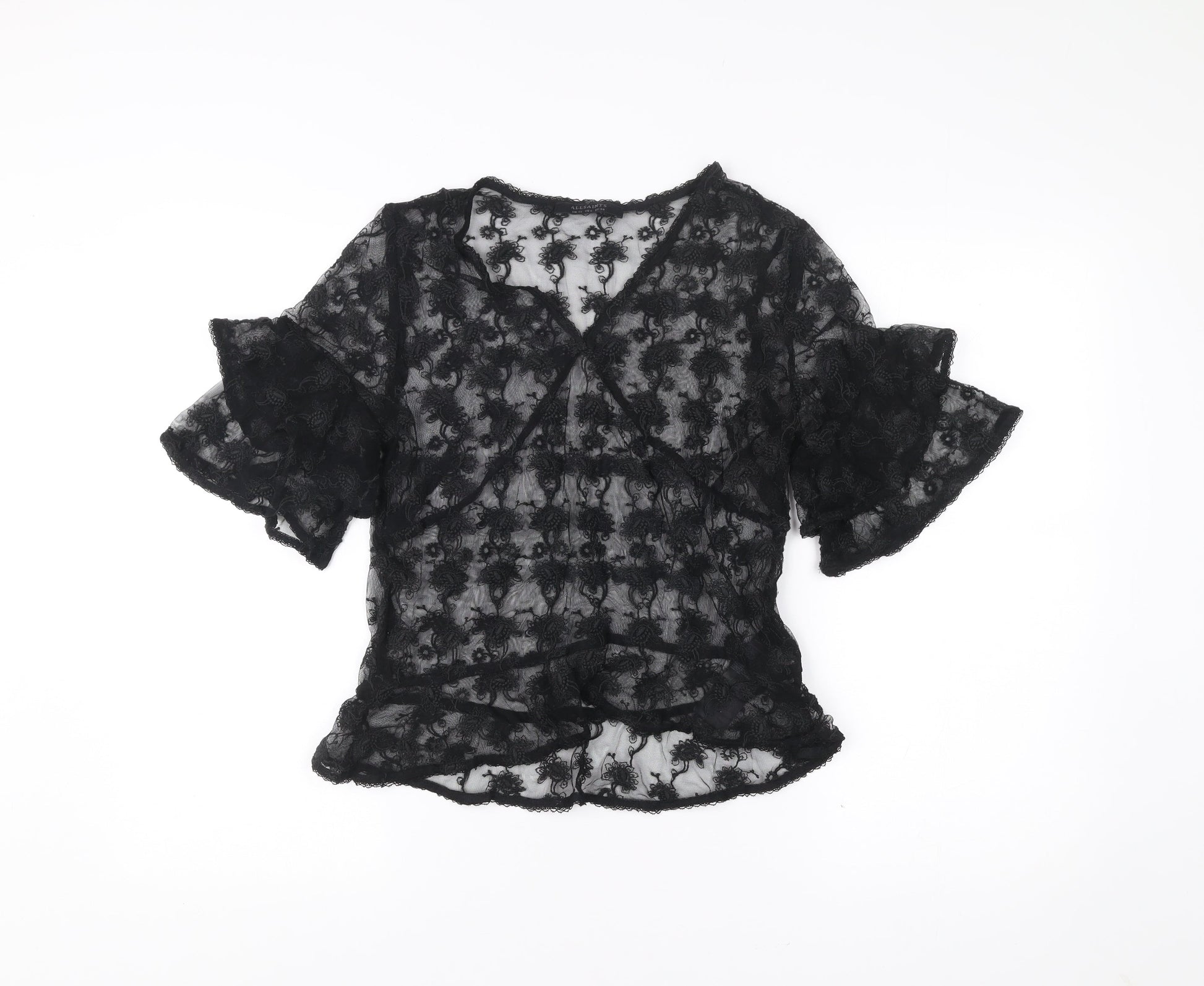 AllSaints Womens Black Lace Wrap Blouse UK 10 V-Neck Flared Sleeve
