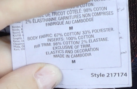 - Material Breakdown: 67% Cotton 33% Polyester 98% Cotton 2% Elastane