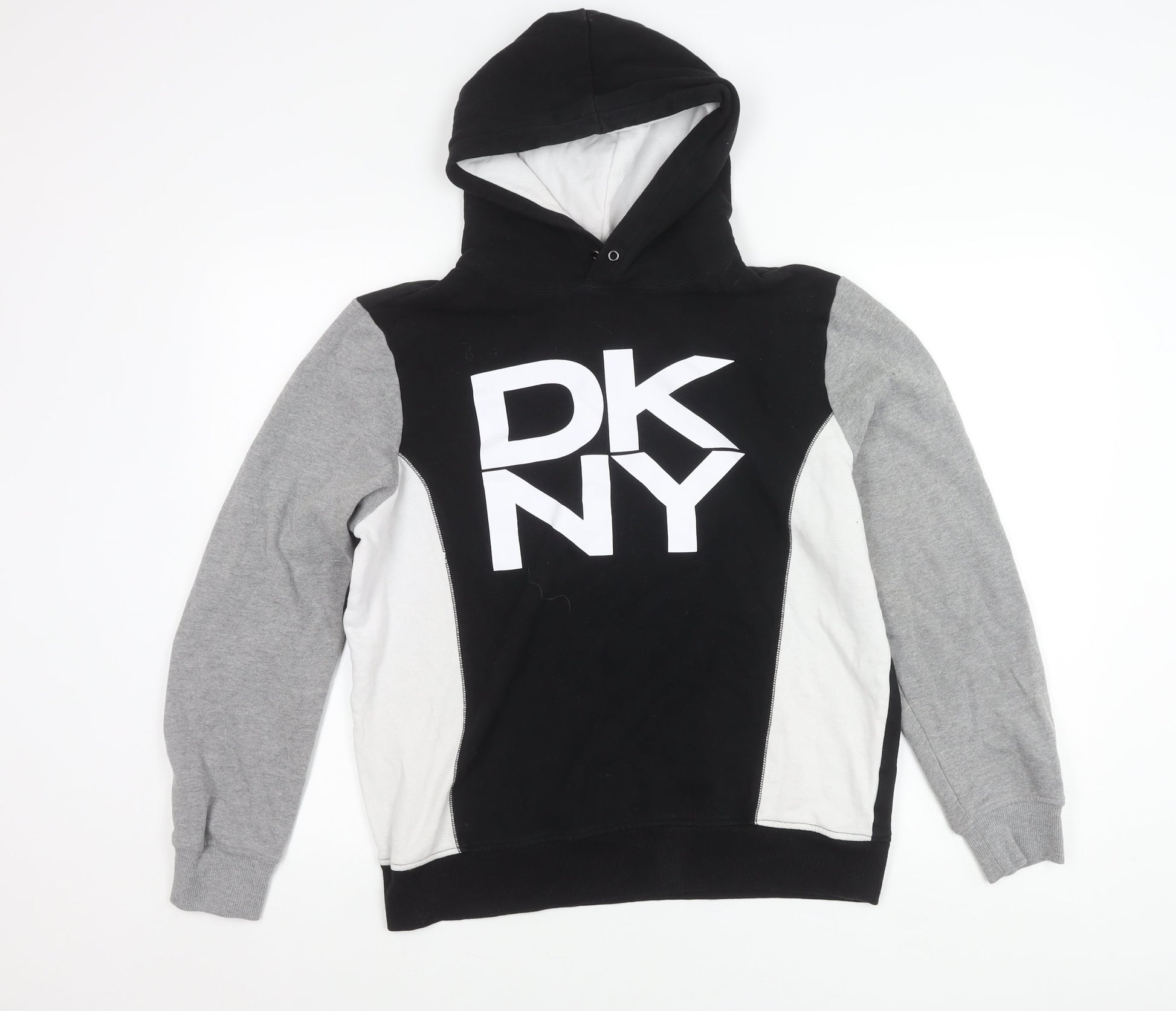DKNY Womens Black Grey White Pullover Hoodie M Logo Casual Fleece