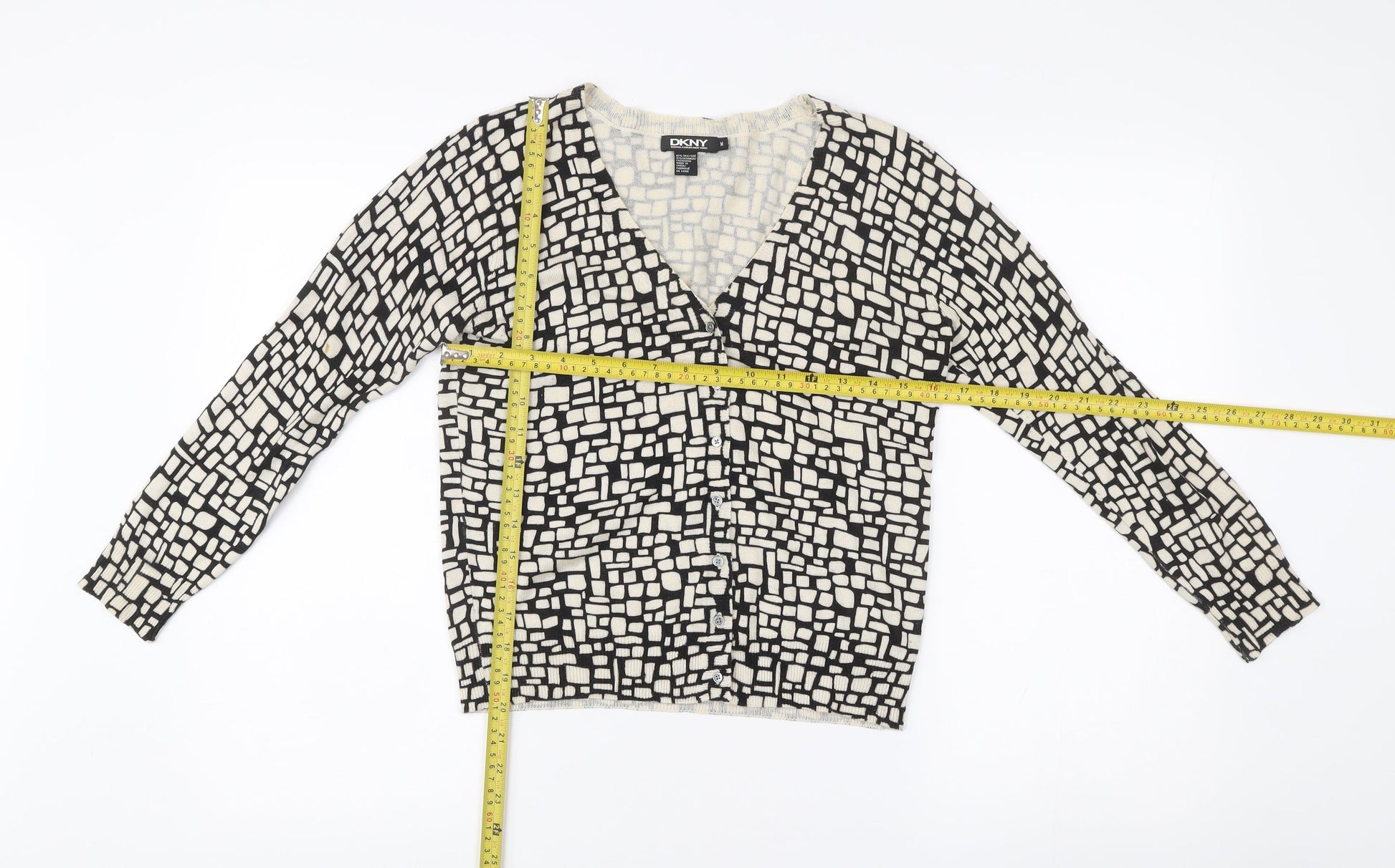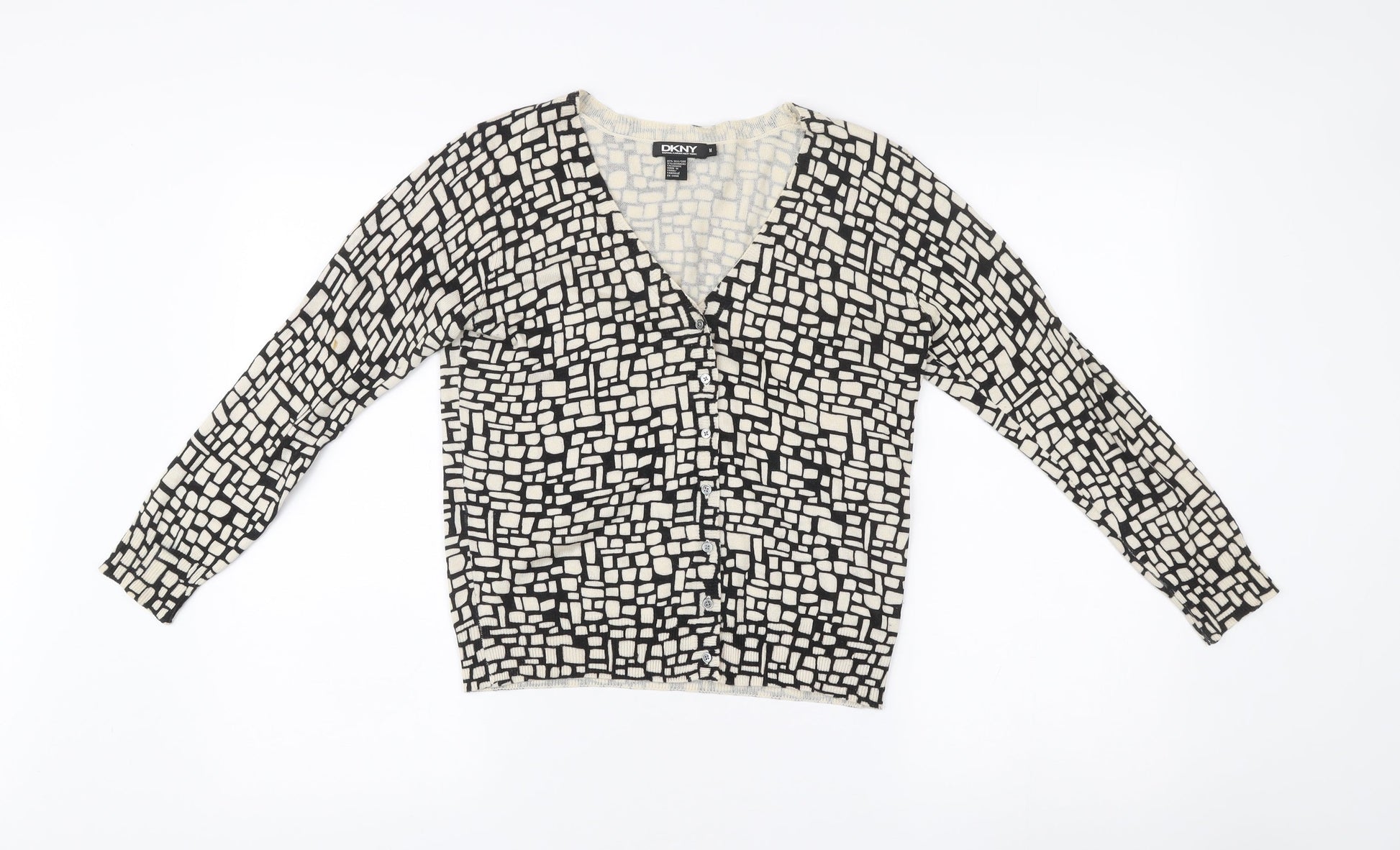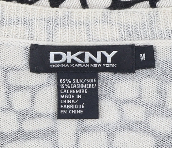 DKNY Womens Black White Silk Cashmere V-Neck Cardigan M