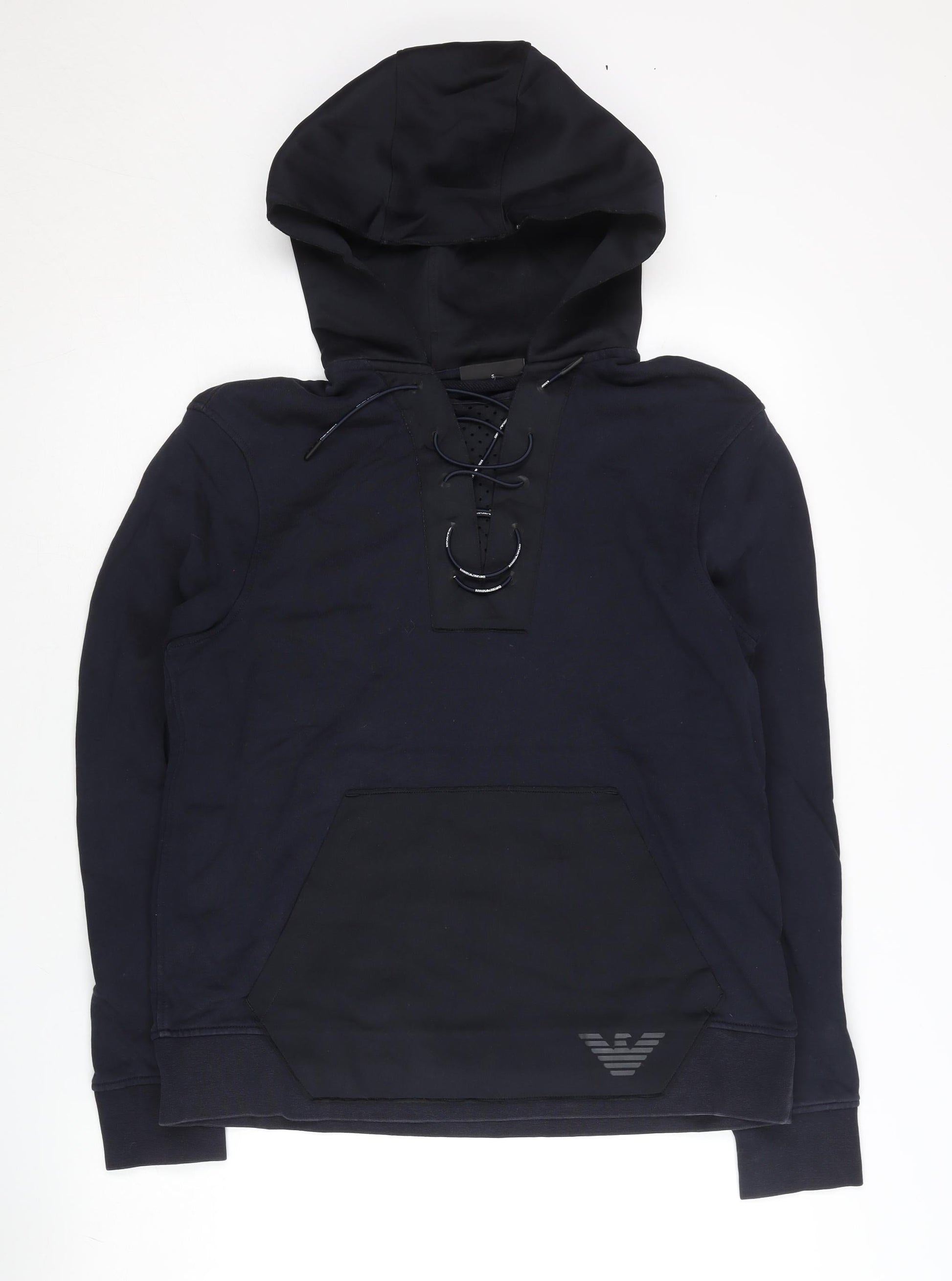 Emporio Armani Men's Black Small Henley Hoodie Lace Up Logo