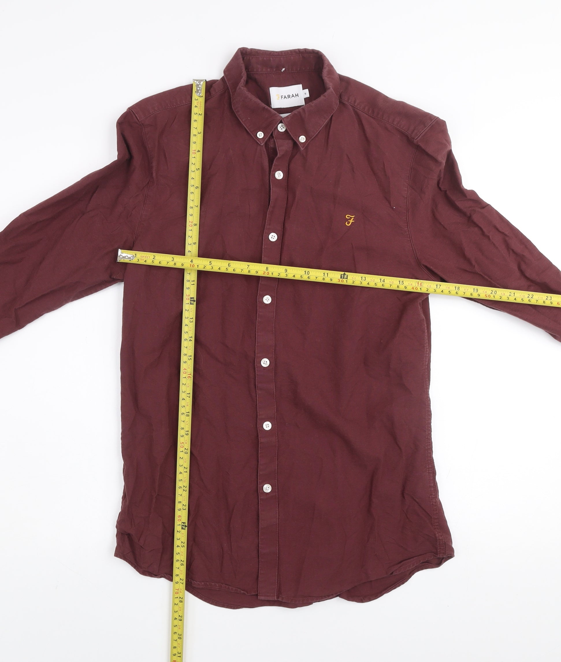 Farah Men's Burgundy Slim Fit Button-Up Cotton Long Sleeve Shirt M