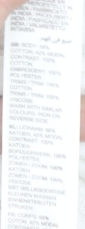 - Material Breakdown: 58% Cotton 42% Modal Embroidery 100% Polyester Trims 100% Cotton Trims 100% Viscose