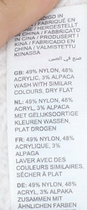- Material Breakdown: 49% Nylon 48% Acrylic 3% Alpaca