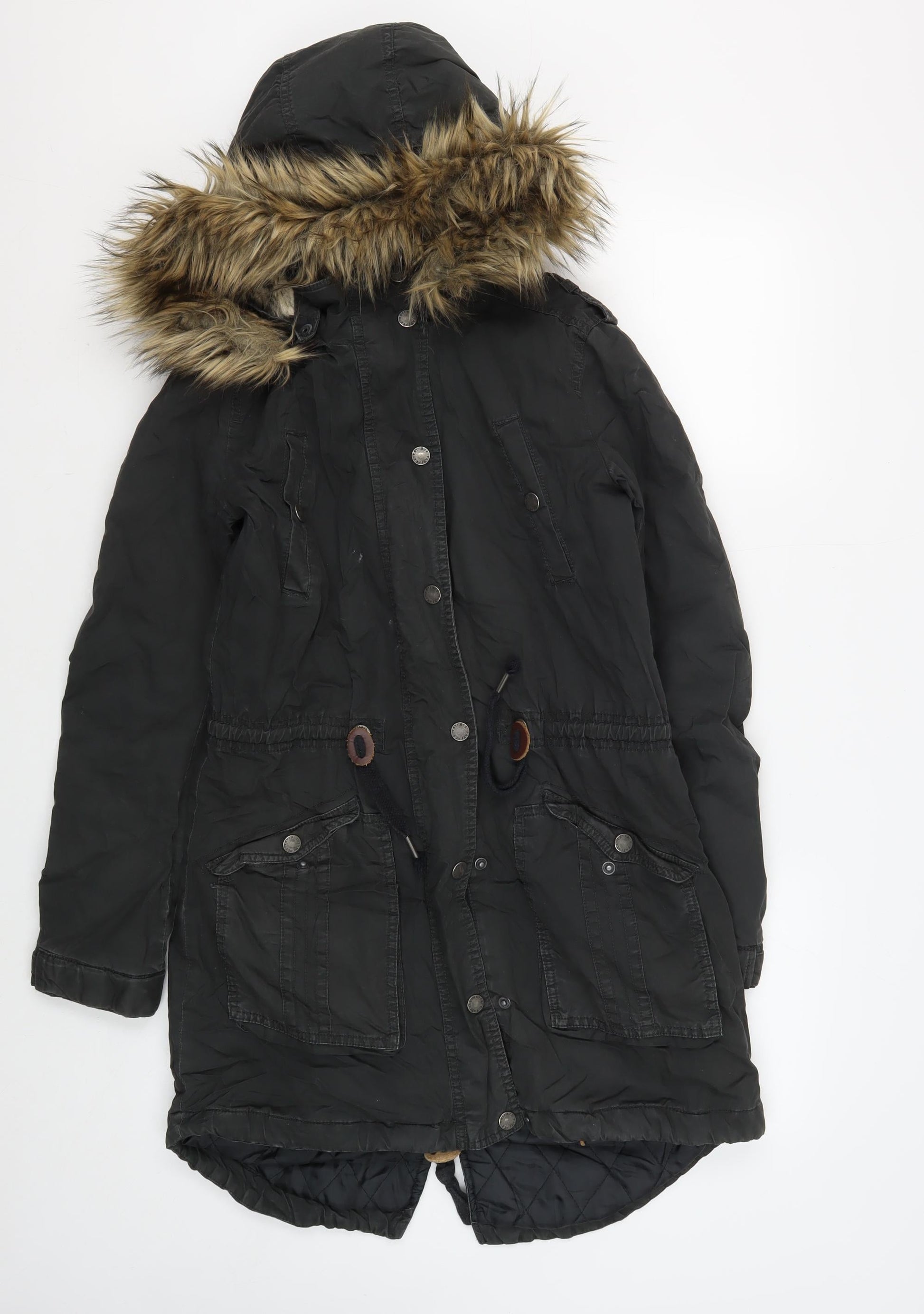 FatFace Women's Black Parka Coat Size 8 with Fur Trim