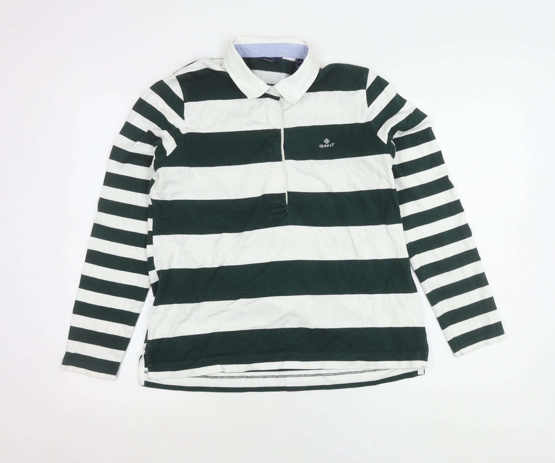 Gant Women’s Green White Striped Long Sleeve Polo Shirt Size M