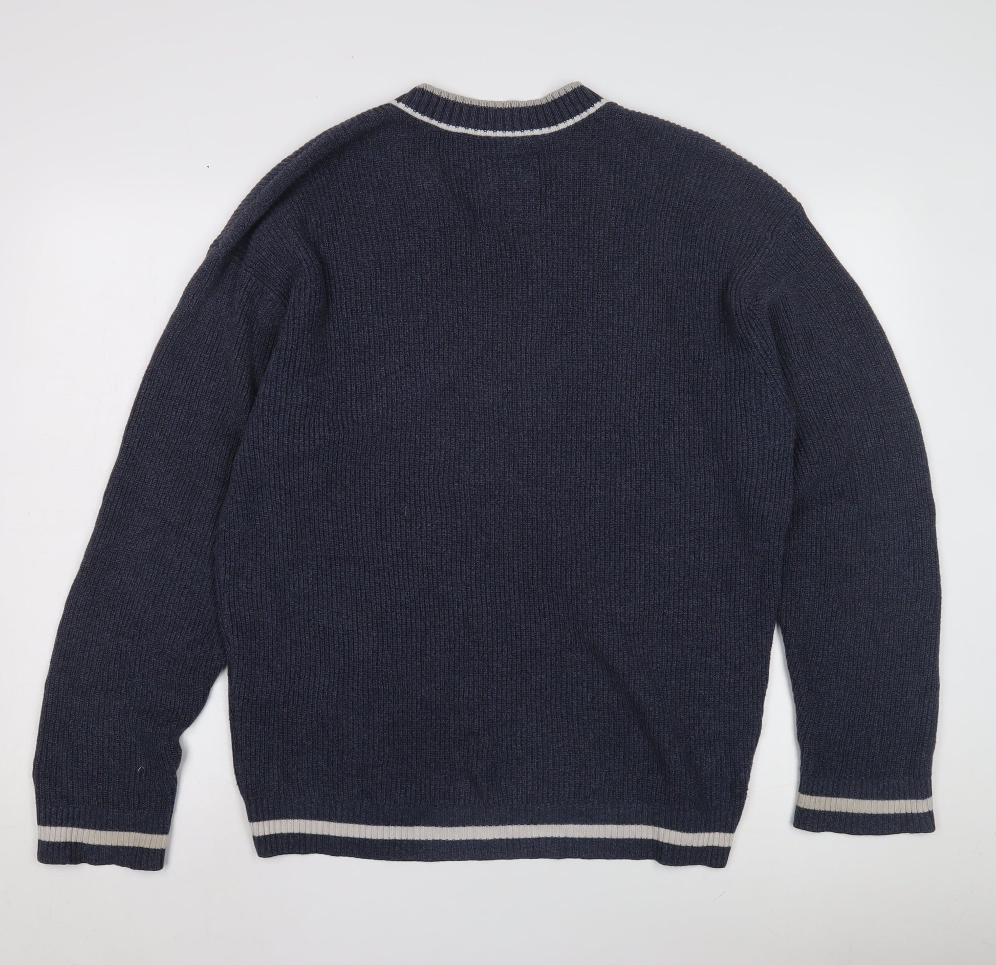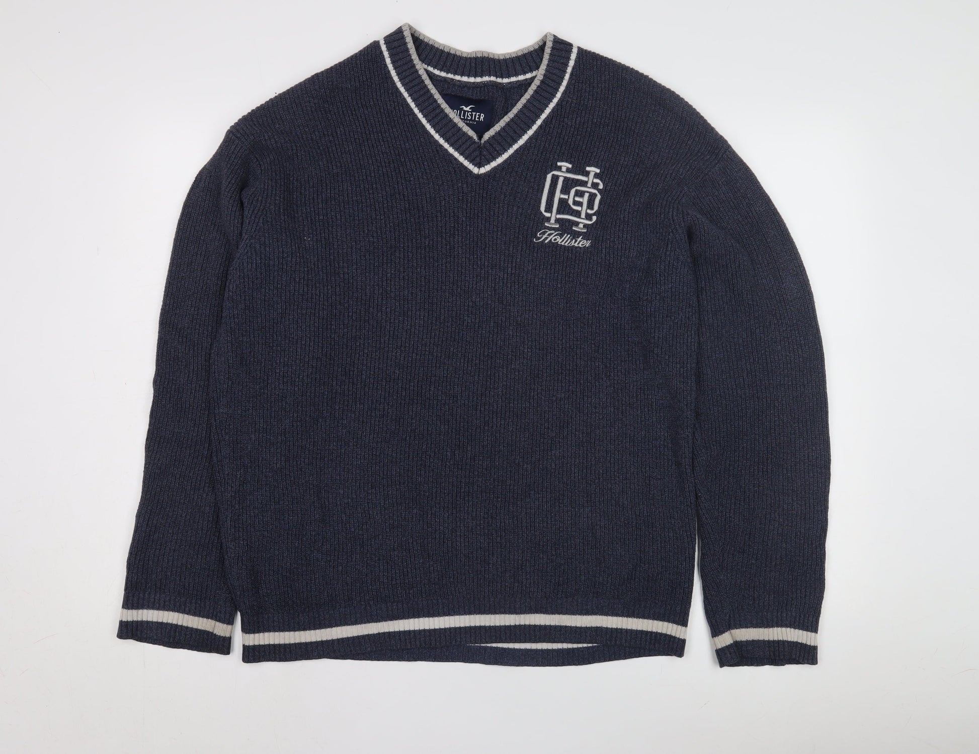 Hollister Men's Blue V-Neck Knit Jumper L, Logo Accent