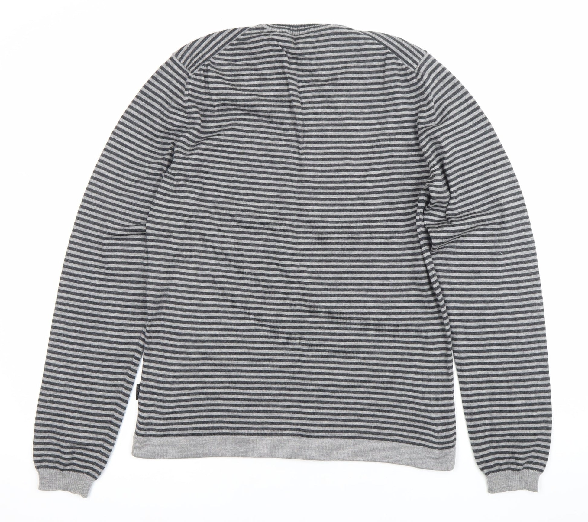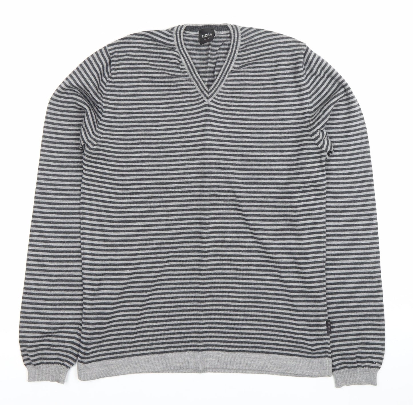 Hugo Boss Men’s Grey Striped Slim Fit V-Neck Cotton Jumper M