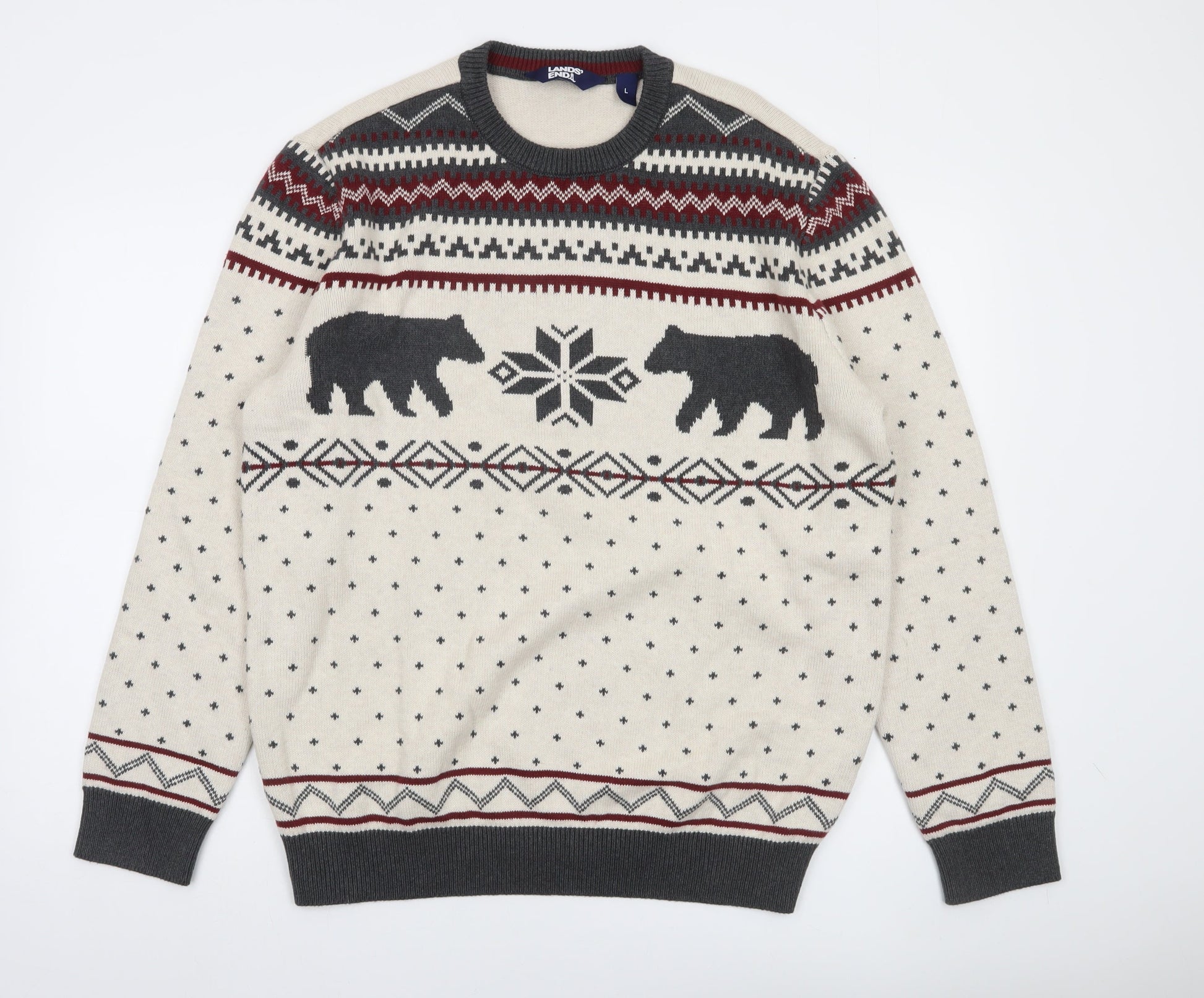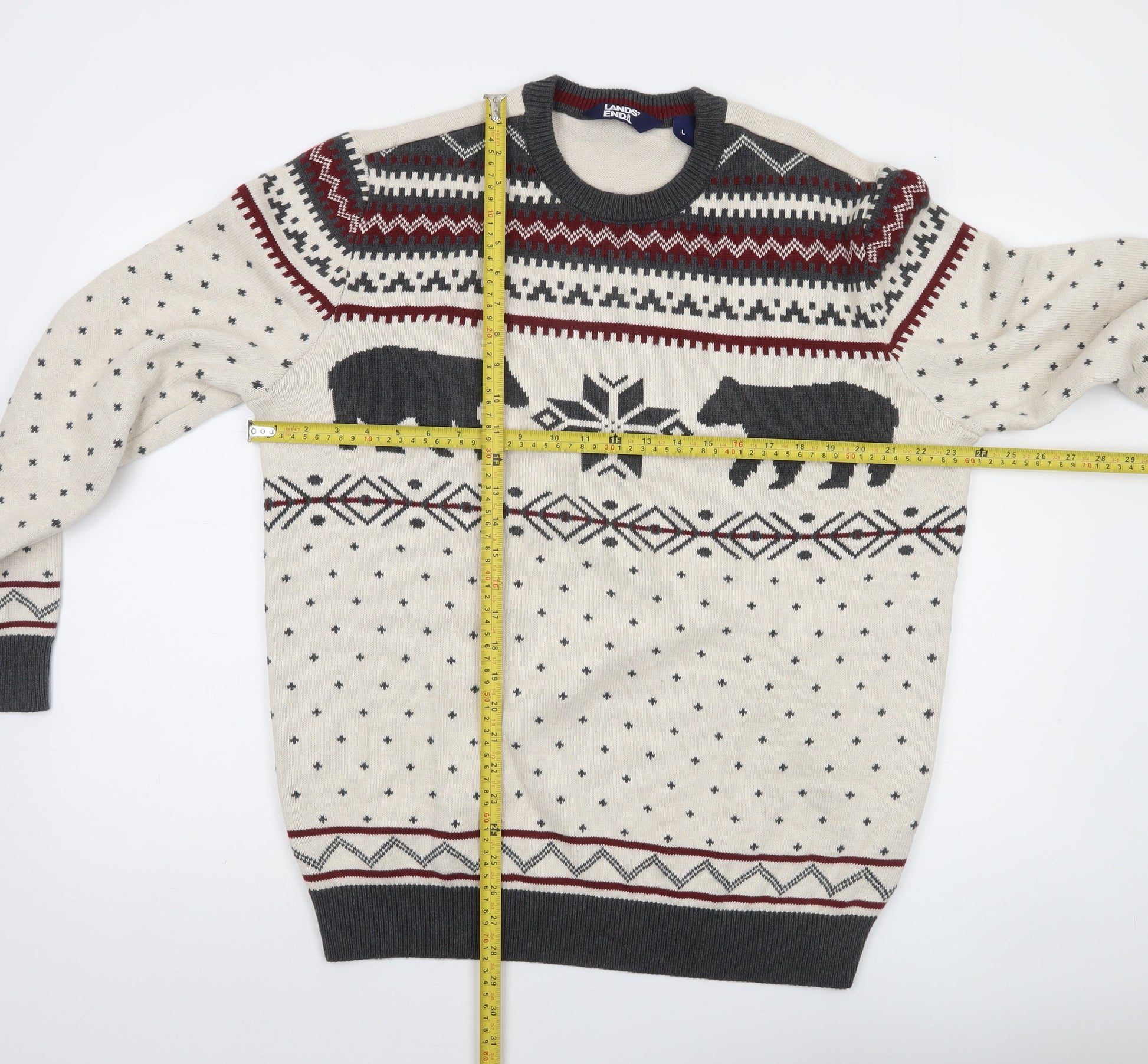 Lands' End Men's Beige Cotton Fair Isle Bear Jumper Size L