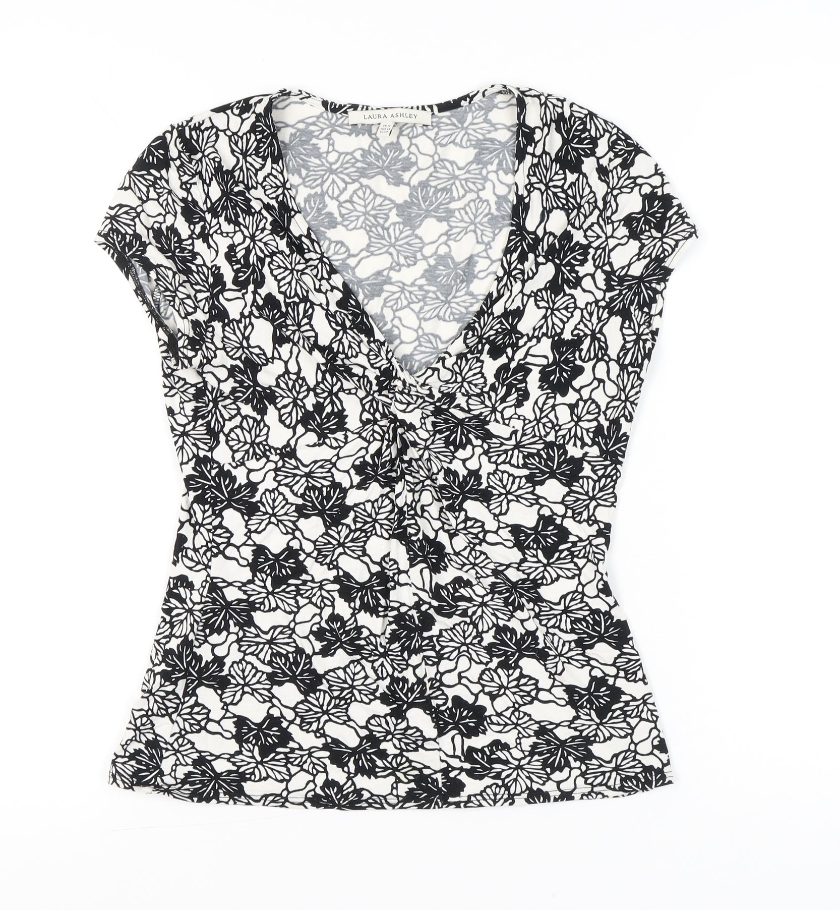 Laura Ashley Womens Black White Floral Blouse UK 12 Short Sleeve V-Neck Wrap