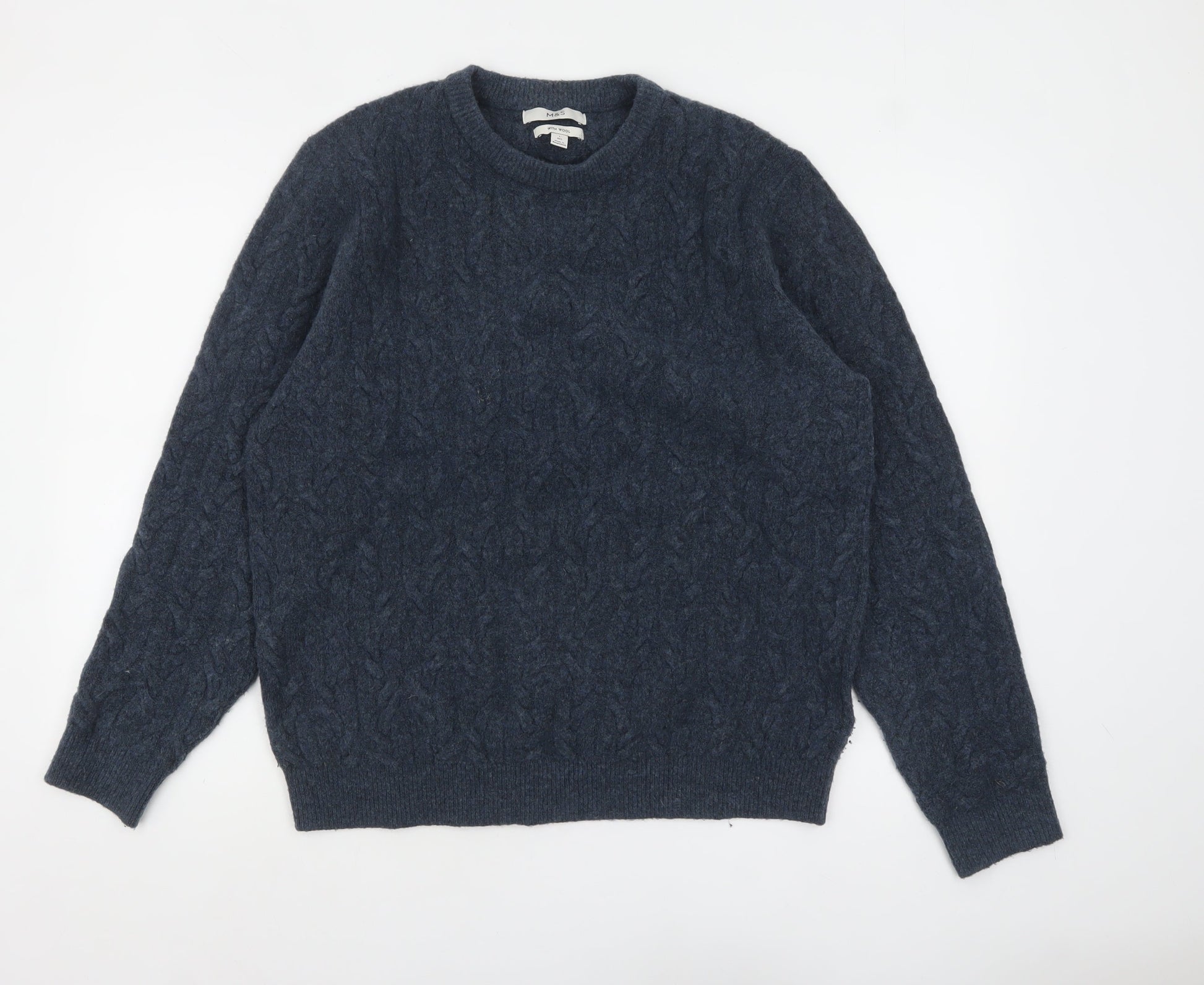 Marks and Spencer Men's Blue Cable Knit Wool Blend Jumper Size L