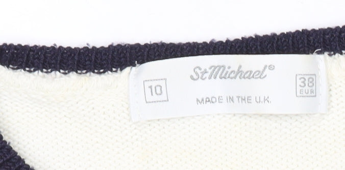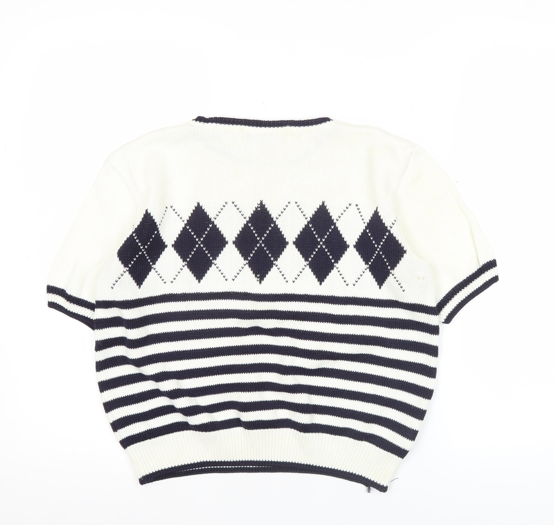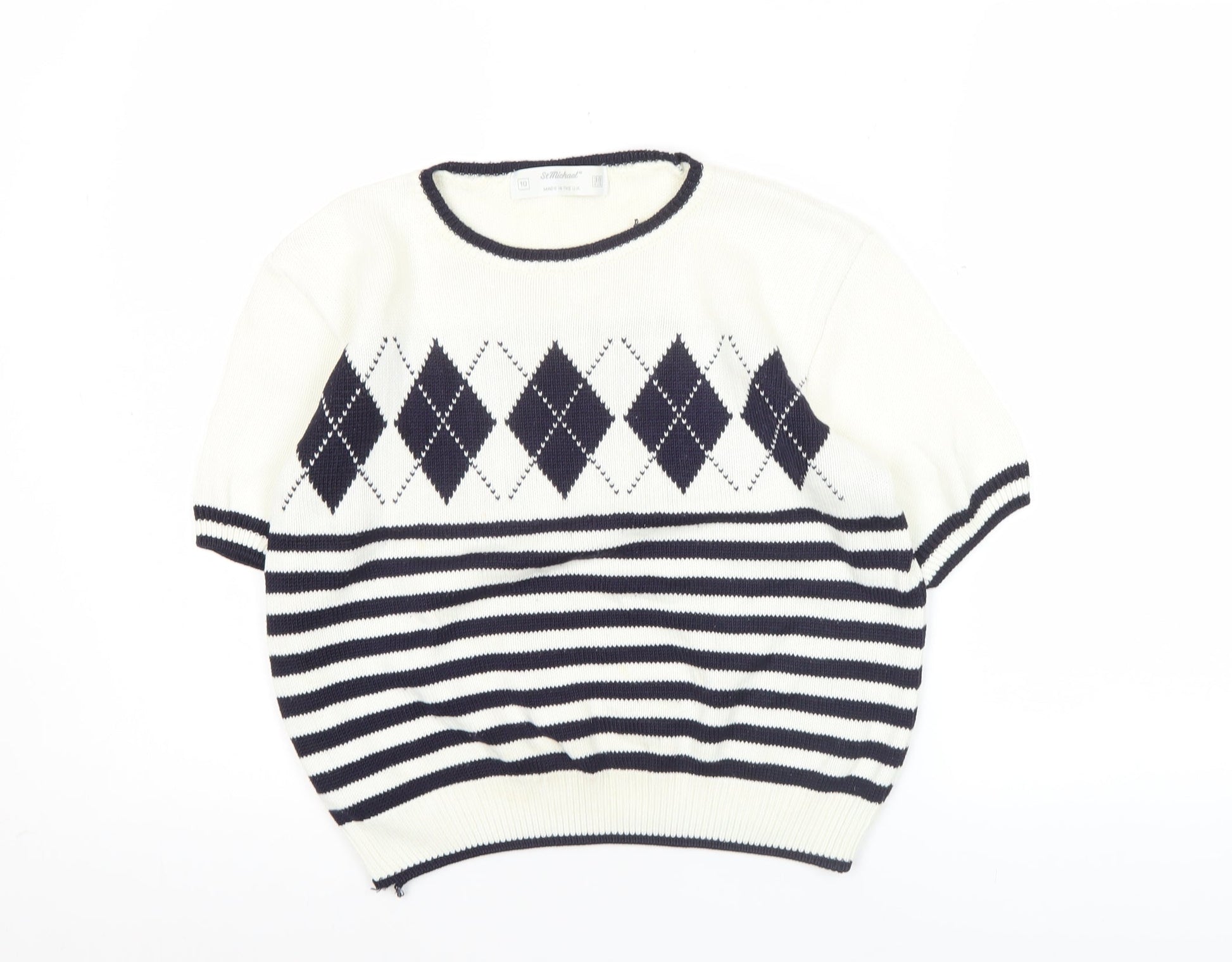 Marks and Spencer Women White Jumper Size 10 Argyle Striped Short Sleeve