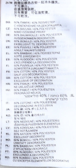 - Material Breakdown: 60% Cotton 40% Polyester