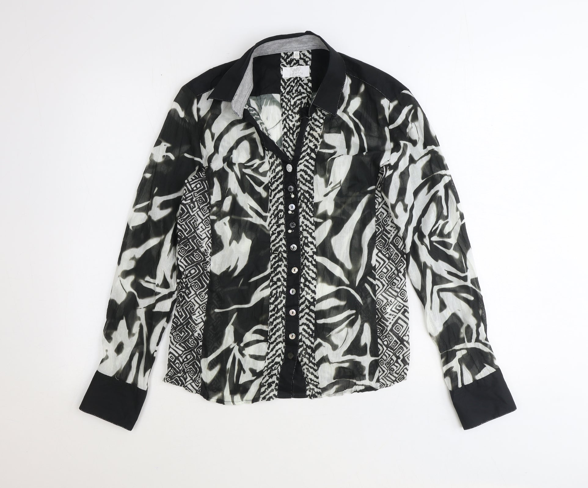 OFF!-White Womens Black Geometric Polyester Basic Button-Up Size 8 Collared