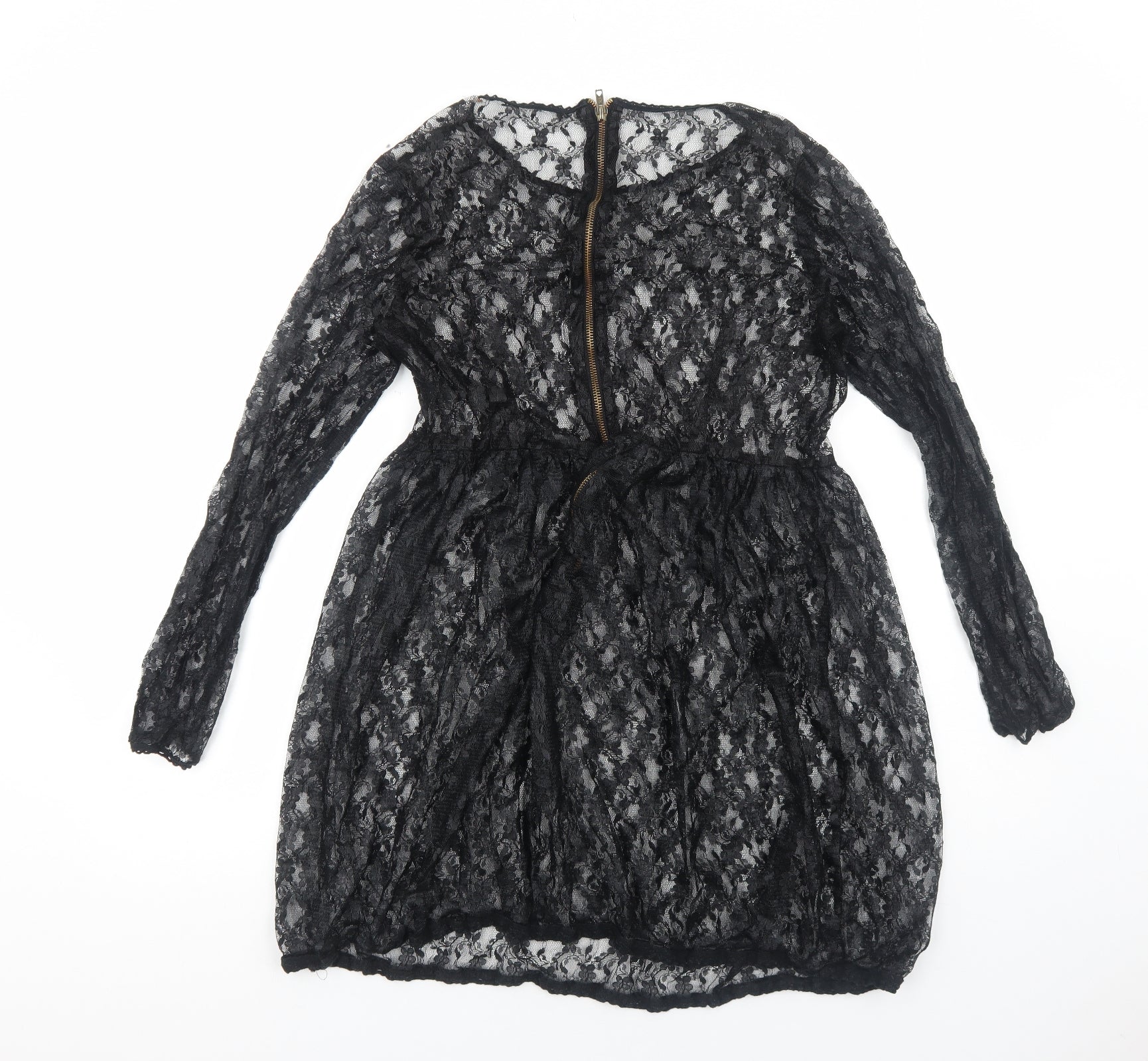 Preworn Womens Black Floral Polyester Skater Dress Size M Round Neck Zip