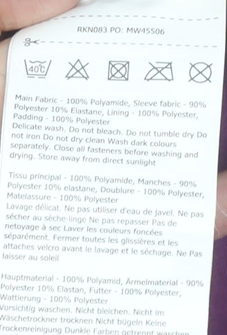 - Material Breakdown: Main fabric: 100% Polyamide Sleeve fabric: 90% Polyester 10% Elastane Padding: 100% Polyester