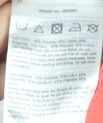 - Material Breakdown: 49% Polyester 35% Cotton 16% Polyamide
