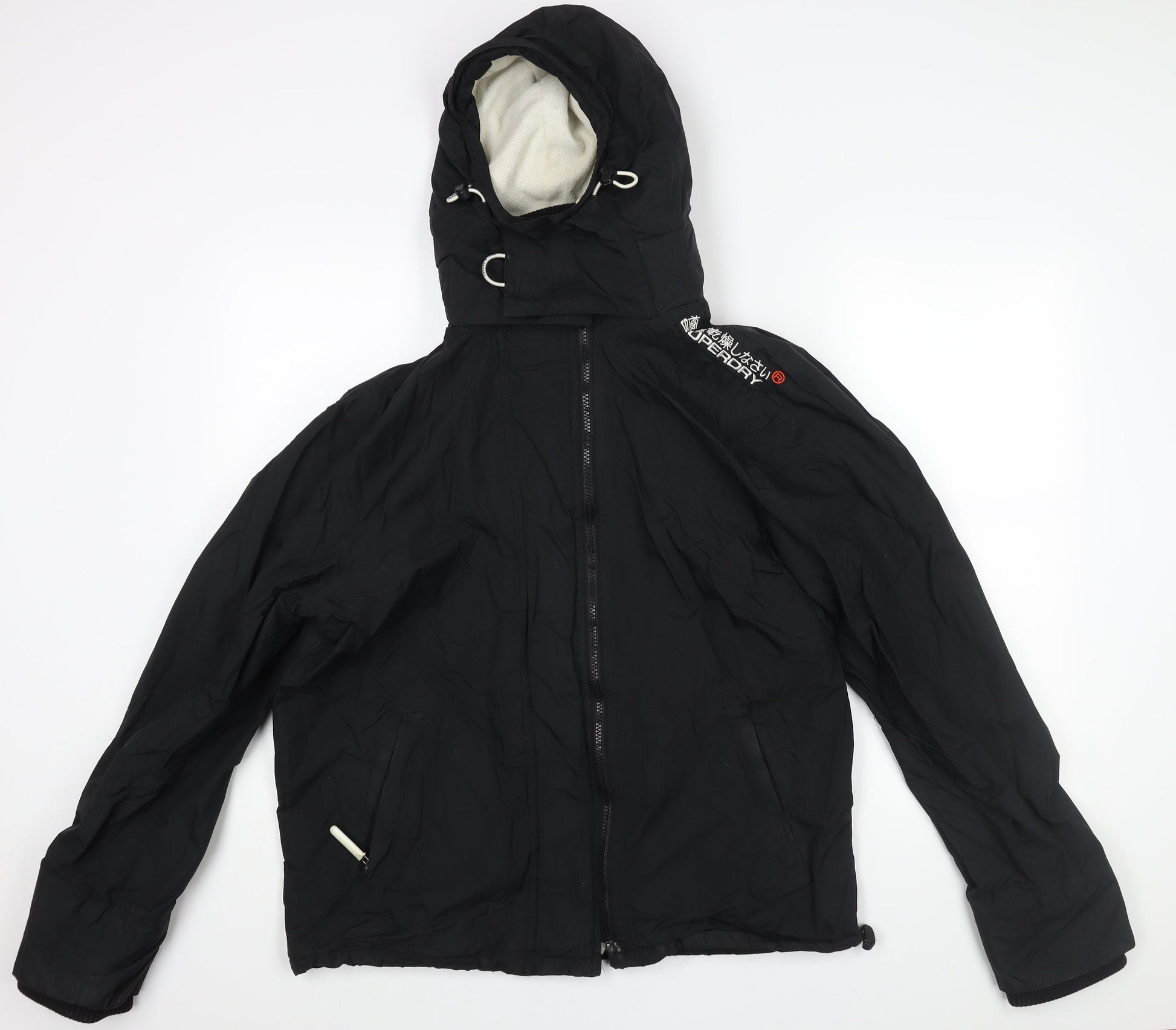 Superdry Mens Black Rain Coat Coat Size XL Zip - Logo Drawstring Fleece Lined