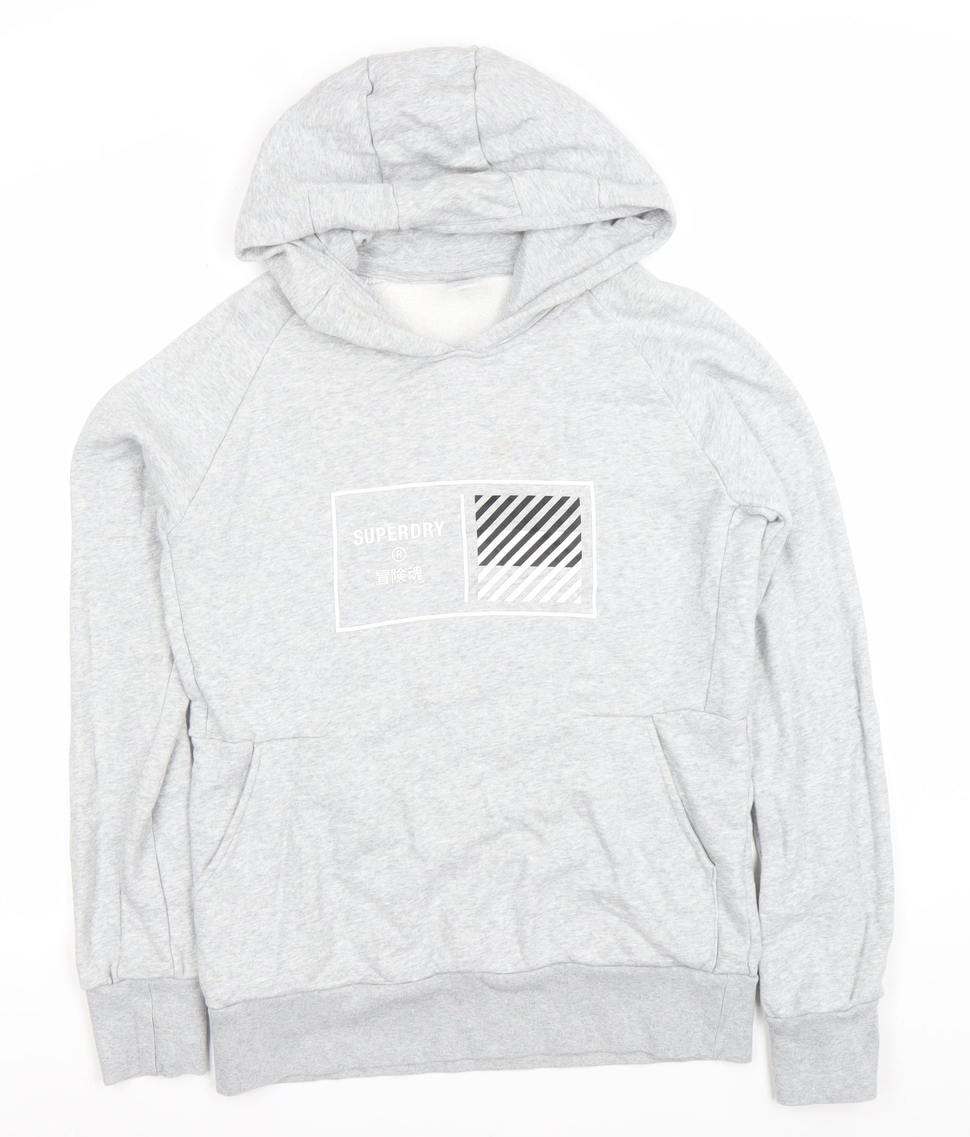 Superdry Men's Grey Pullover Hoodie Large Logo Fleece Sweatshirt