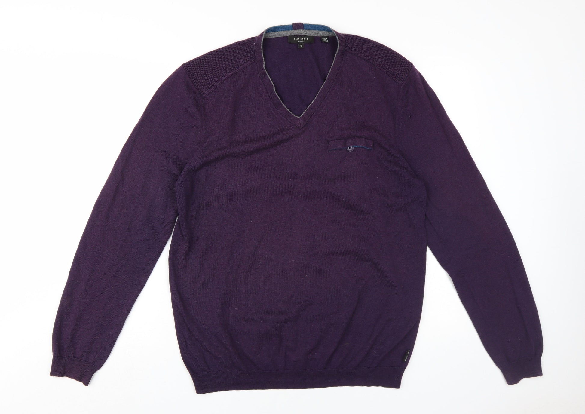 Ted Baker Men's Purple Wool Cashmere V-Neck Jumper Size 10