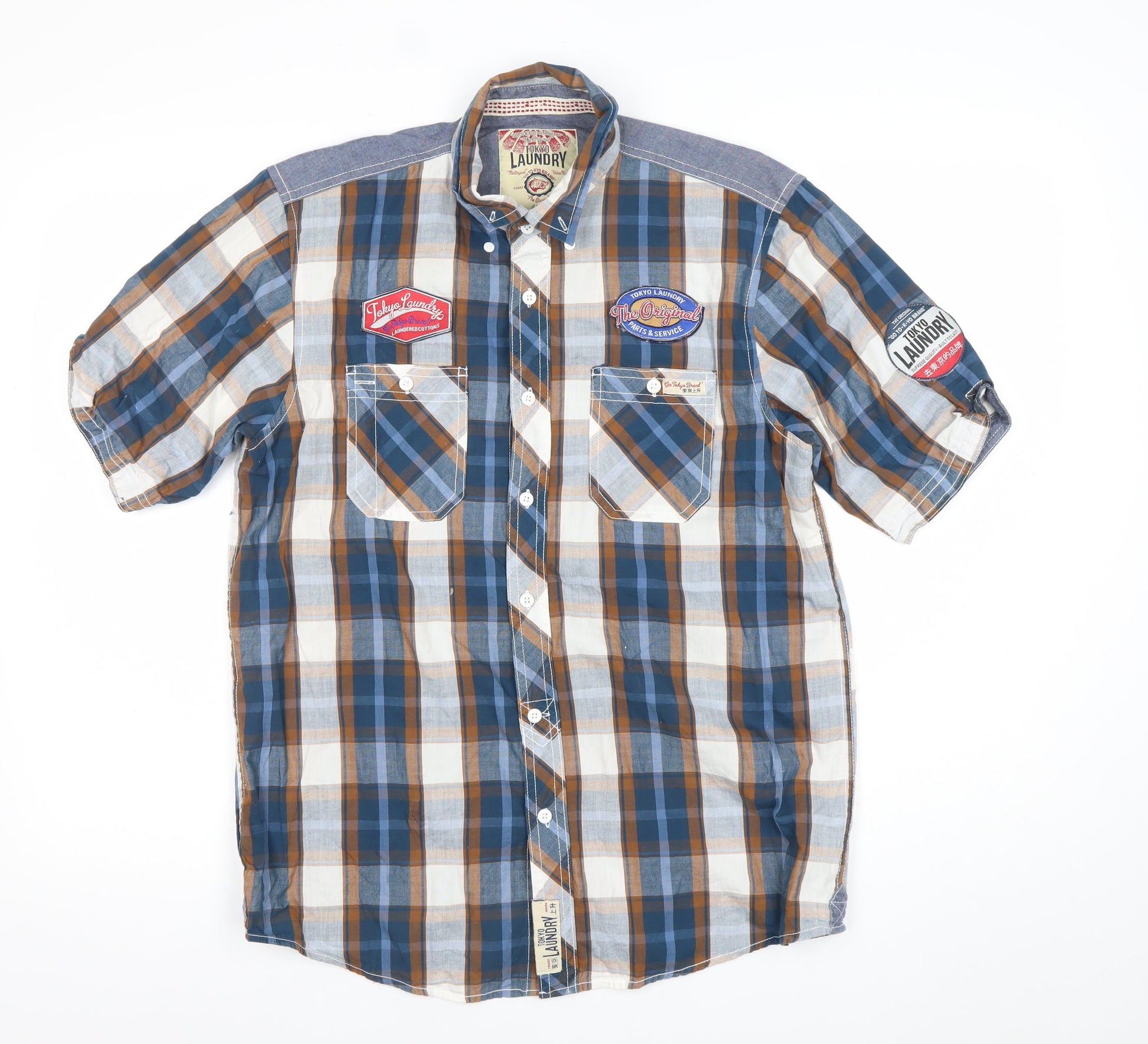 Tokyo Laundry Men’s Blue Checked Short Sleeve Button-Up Shirt Medium