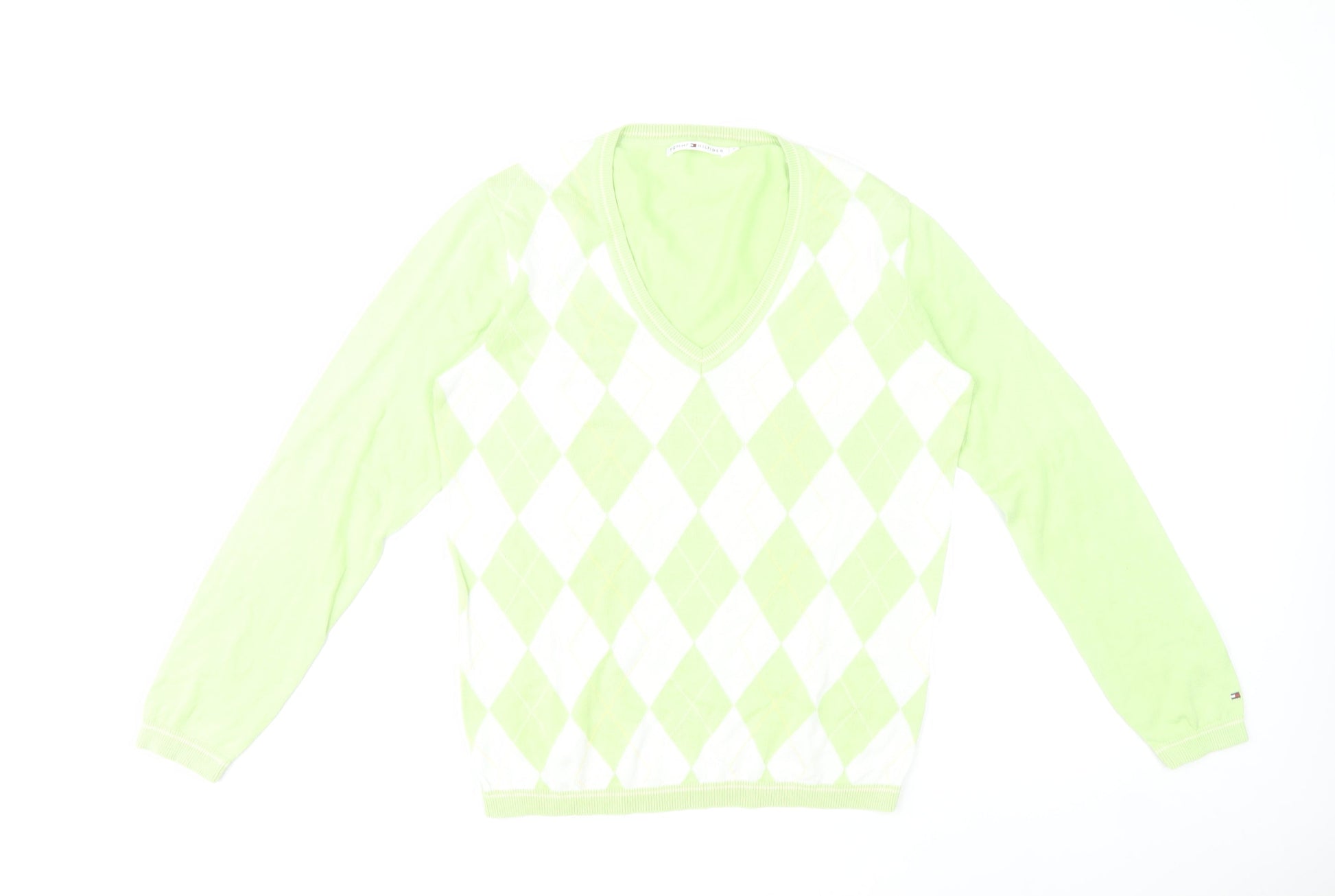 Tommy Hilfiger Women's Green Argyle V-Neck Cotton Jumper L