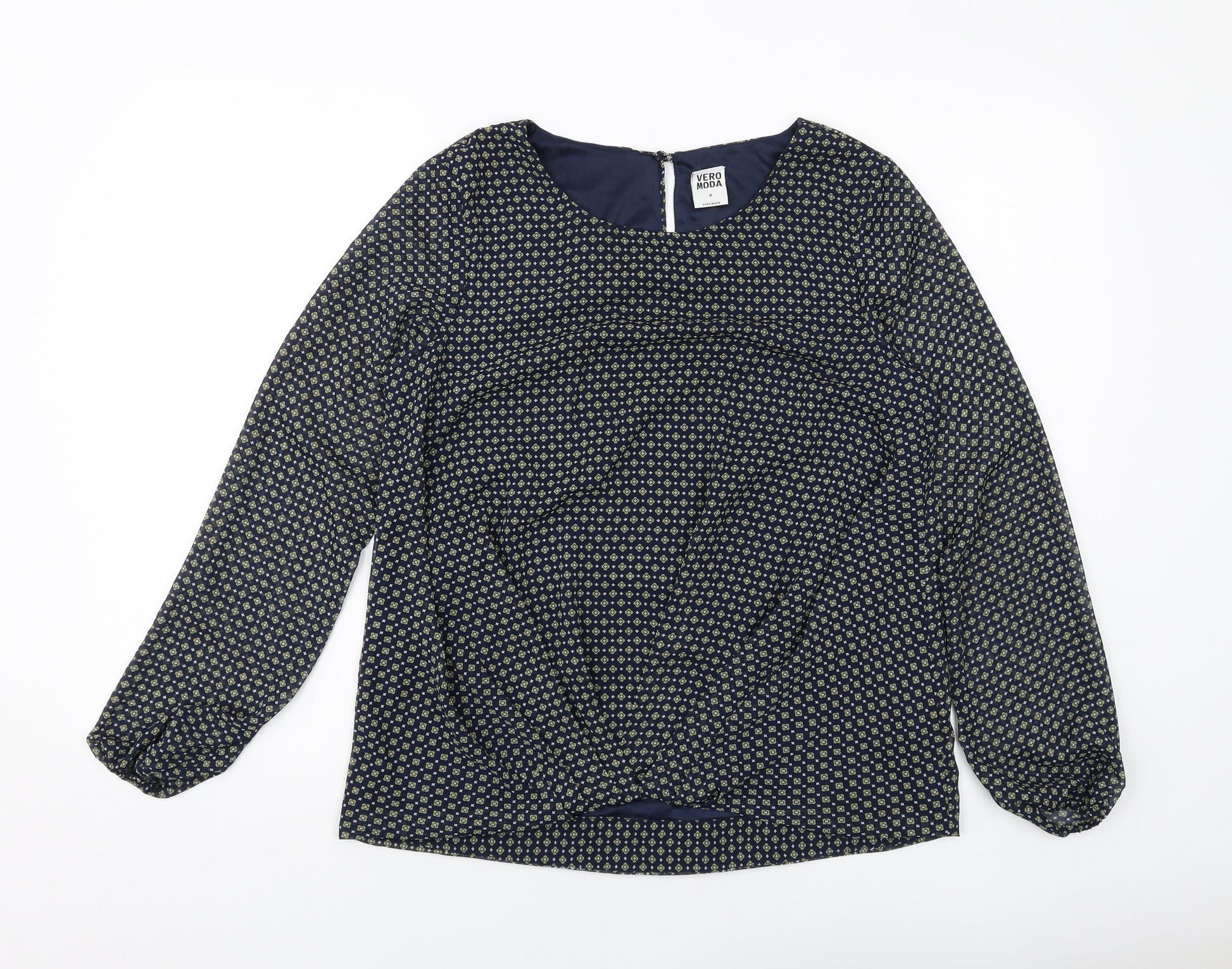 VERO MODA Womens Blue Geometric Polyester Basic Blouse Size M Round Neck