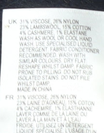 - Material Breakdown: 31% Viscose 26% Nylon 23% Lambswool 16% Cotton 4% Cashmere 1% Elastane