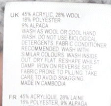 - Material Breakdown: 45% Acrylic 28% Wool 18% Polyester 9% Alpaca