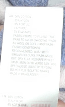 - Material Breakdown: 50% Cotton 35% Nylon 8% Acrylic 4% Wool 3% Elastane