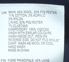 - Material Breakdown: 46% Wool 39% Polyester 11% Cotton 2% Acrylic 2% Nylon