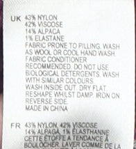 - Material Breakdown: 43% Nylon 42% Viscose 14% Alpaca 1% Elastane