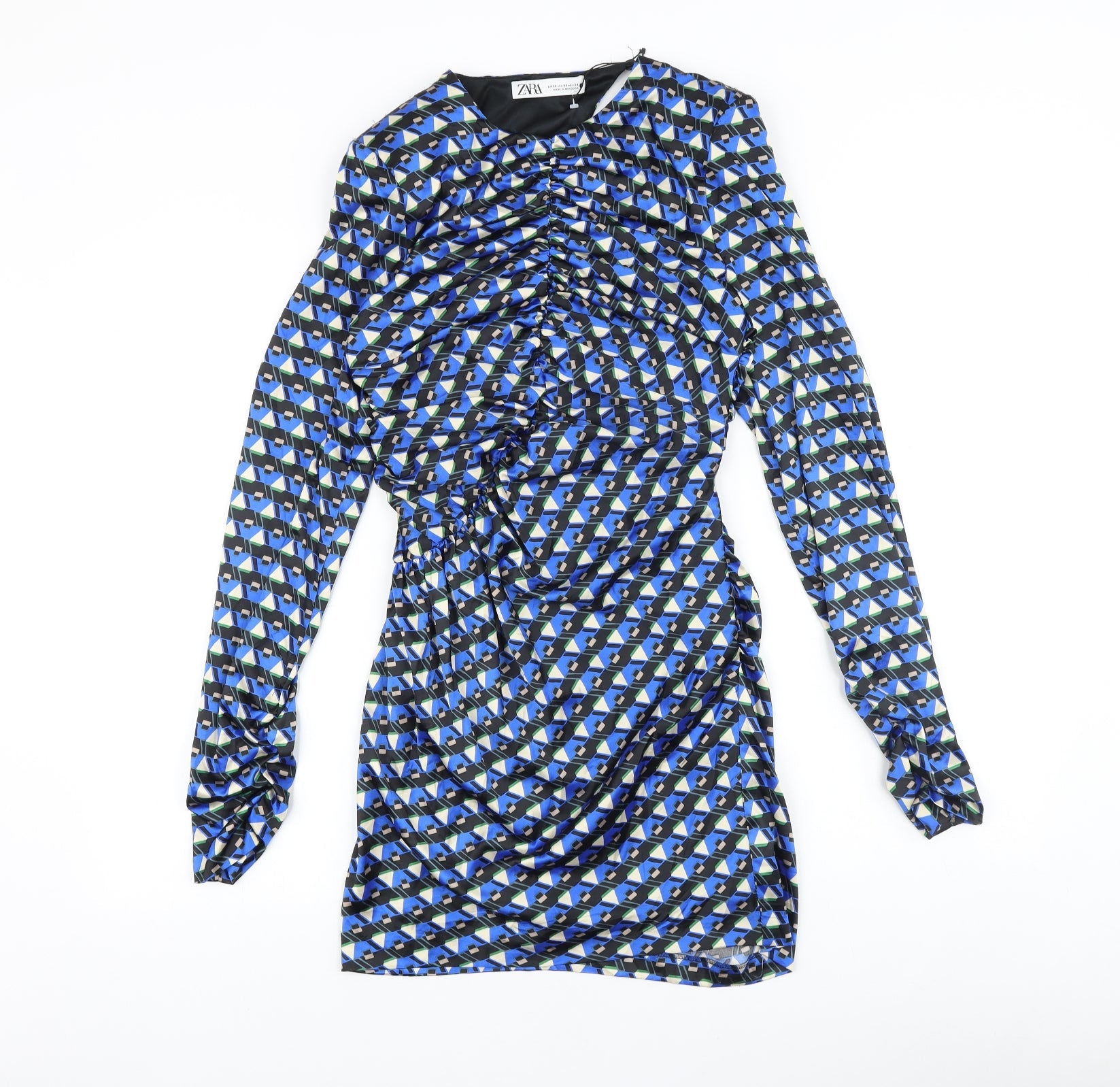 Zara Womens Blue Geometric Polyester Bodycon Size S Round Neck Zip
